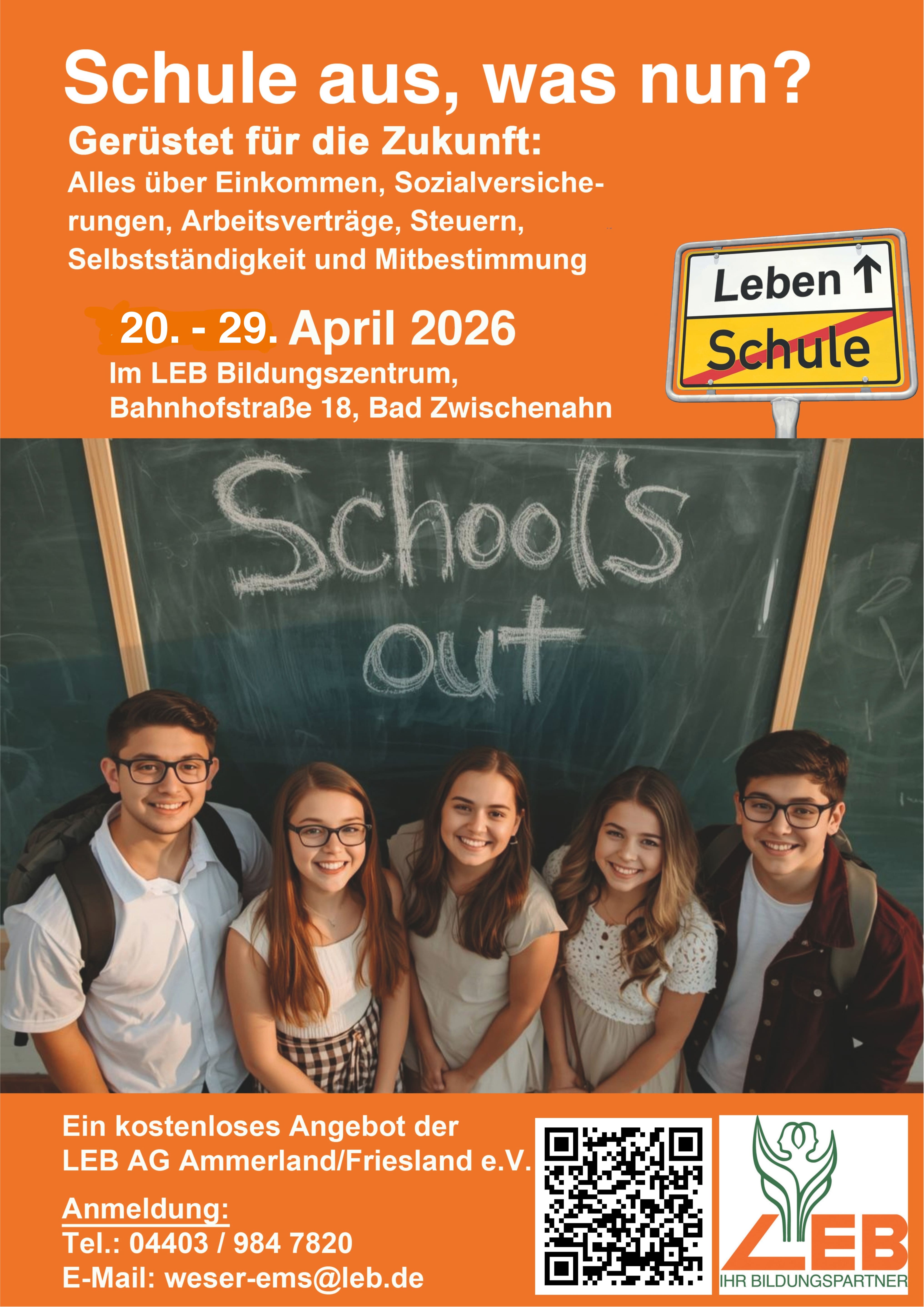 Das Bildungsangebot der LEB AG Ammerland/Friesland e.V. richtet sich gezielt mit verschiedenen Themen an junge Menschen, die an der Schwelle zum Berufsleben stehen. Hilfreiches Wissen und praktische Tipps für den gesellschaftlichen und beruflichen Alltag sollen die Schulabgänger:innen auf den neuen Lebensabschnitt unterstützend vorbereiten.